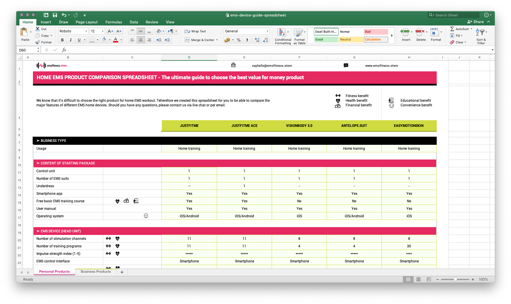 We know well that it's difficult to choose the right product both for home and studio EMS workout. Teherefore we created a spreadsheet for you to be able to compare the major features of different EMS devices.